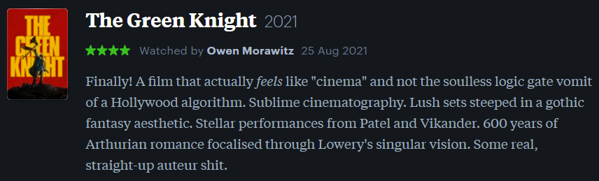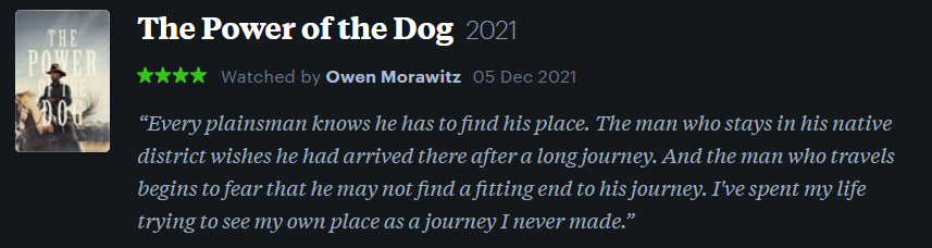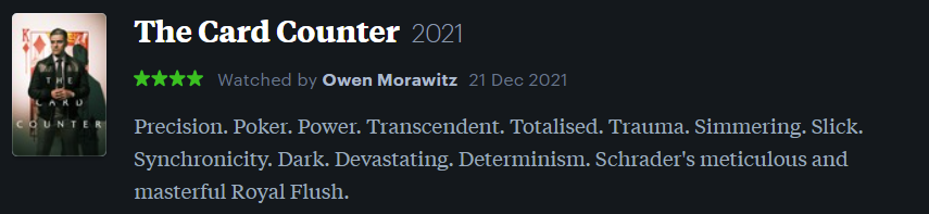 Anyway, according to my Letterboxd Watch List tracker, I watched a total of 56 recent release films in 2021, which is a little over one a week. Not bad. (I’m aiming for 100 this year.)