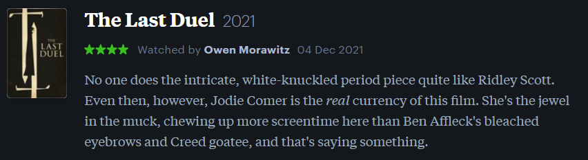 I loved this film and it also bombed super hard at the box office, which is a little weird and perplexing. I’m not sure if it’s the crowded release schedule situation or COVID or people just not wanting to watch a theatrical period piece about fragile male egos, rape and the patriarchy… It could honestly go either way. Anyway, Ridley Scott blames the millennials for this outcome and he’s not entirely wrong, right? <insert “Old Man Yells at Cloud” meme here>