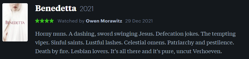 Synopsis: “In the late 17th century, with plague ravaging the land, Benedetta Carlini joins the convent in Pescia, Tuscany, as a novice. Capable from an early age of performing miracles, Benedetta’s impact on life in the community is immediate and momentous.”