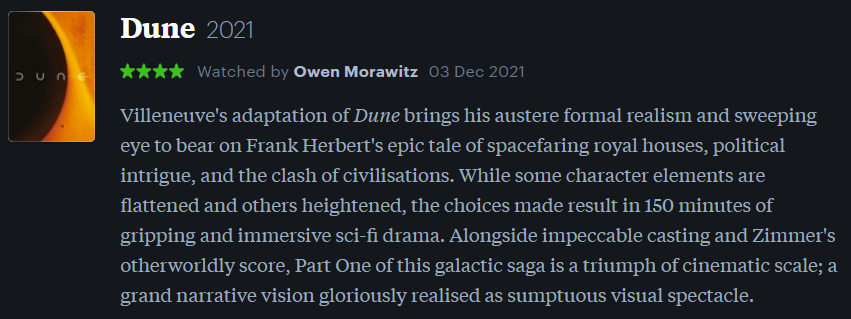From here, I’ve narrowed these down to my favourite eight films with a rating of four stars or higher. So, this is the best of the best in my very humble opinion. Blah blah subjectivity, your user experience may vary, etc. Enjoy!