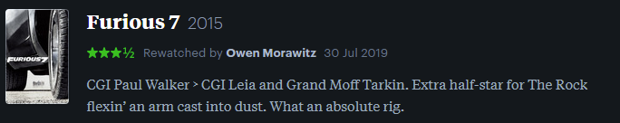 I’d argue this is probably the best film in the franchise due to the sense of narrative stakes involved. While the crew do lizard brain, death-defying shit all the time, there are actual consequences shown here. Not to mention the real-life passing of original star Paul Walker and his memorial tear-jerker showreel.