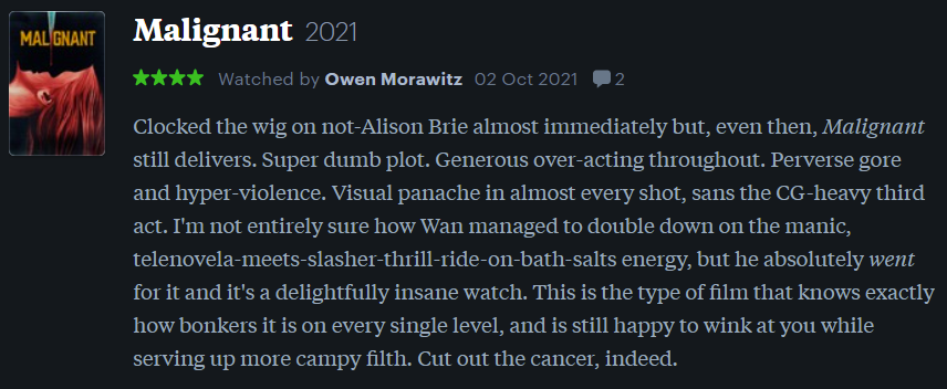 As I mentioned in my Best Films of 2021 list earlier this year, anything I say about this film is just an unnecessary spoiler. So, stop what you’re doing. Don’t read this. Just go in blind and watch Malignant right now. Don’t even bother reading my Letterboxd review below. (Don’t you do it!) I am imploring you to turn off your phone/tablet/laptop/device. Throw it in the river. Set it on fire and spread the ashes to the wind. Watch this film and let nothing stand in your way.