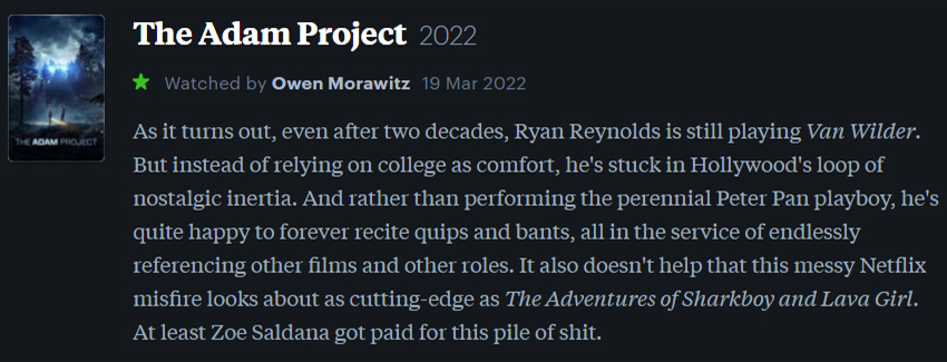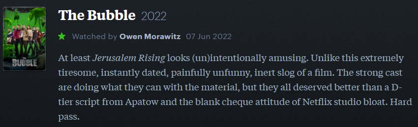 This might just be the vapidest, entirely ephemeral thing Judd Apatow has ever produced. (Or directed. Or written, for that matter.) Even now, I struggle to recount any particular plot elements or stylistic attributes to complain about. There’s just… nothing here, really. So yeah, don’t watch it. Don’t give Netflix’s algorithmic overlords that level of background noise satisfaction. Watch The 40-Year Old Virgin or Knocked Up instead. Please. I beg of you. Think of the children (aka the Zoomers on TikTok not watching this movie).