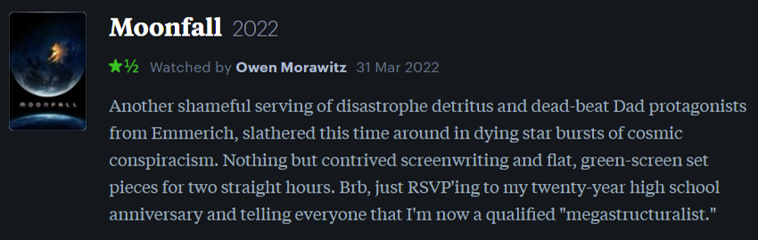 I did this because, like the sucker I am, I thought Moonfall might actually be a return to form for the undisputed king of disastrophe filmmaking. Well, how far the mighty have fallen. This was a painful slog to get through and might just be one of Emmerich’s ugliest films, too. (And for the guy with the esteemed privilege of having Independence Day: Resurgence in his filmography… yikes.) Not even the totally bonkers premise of this film could save it from breaking hate-watch orbit and falling to spectacular new lows. *Sullen deadbeat Dad voice* “I’m not mad, I’m just disappointed.”