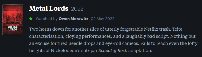 Written by Game of Thrones co-creator D.B. Weiss, Metal Lords purports to be a coming of age tale about three outsider kids who bond over a shared love for heavy music. However, as someone who wasted 98 minutes of their incredibly finite time on this dismal ball of rock hurtling through a cosmic expanse utterly devoid of universal meaning or purpose, I can tell you what this actually is: Hot Topic School of Rock, written by someone whose intimate knowledge of “metal” subculture is about as deep as a knock-off Ride The Lightning tee from Target. “Soaked in disgust. You will never be one of us.”