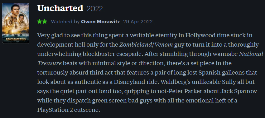 Well, I’m not sure how Hollywood managed to fuck this one up so badly, folks. It’s only been one of the most anticipated video game adaptations of the millennium and—on paper at least—has a straightforward premise (“non-IP infringing Indiana Jones with quips”) that should have been an easy slam dunk. I love me some Whalburger, but he’s horrendously miscast as Sully here, and Holland makes for a thoroughly unconvincing Drake. What the hell was Nathan Fillion doing? He’s already proven that he’s got the chops, and the dude is literally a Nathan in real life! Swing and a miss.