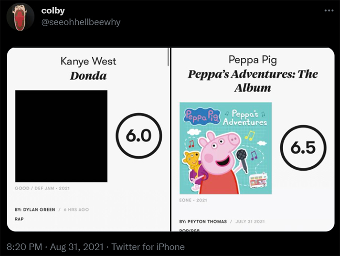 Across ten studio albums and three collaborative LP’s, Kanye has received an average Pitchfork score of 8.2, including six Best New Music tags. And while Donda’s 6.0 is clearly his lowest score, it’s not far off the larger publication average. Interestingly, and for context, Jimmy Eat World have five reviews on the site with an average score of 5.8.