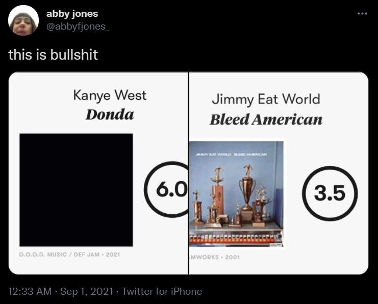 Ultimately, I think that Bleed American is a better album than Donda, and I would happily advance that argument in a review. You might disagree and side with Pitchfork and that’s fine too. But I also feel that nothing of value is gained by comparing a 6.0 to a 3.5 or even a 6.5. It’s mostly pointless and it robs art of the ability to move something in us that only music can do.